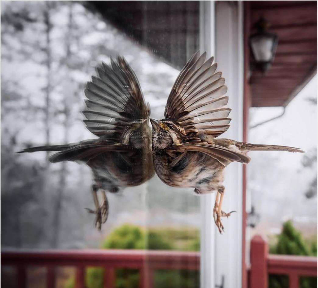 Подобные наклейки, с одной стороны, достаточно крупные, с другой — расположены только в одной части окна, птицам ничего не мешает попытаться их «облететь». К тому же, черные силуэты могут сливаться с отражением на стекле. Маркировки «Целая птица» занимают площадь меньше, чем одна такая наклейка, но распределены по всей поверхности окна, создавая видимую сетку.